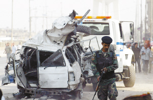 10月23日,一名伊拉克士兵在巴格达的爆炸现场警戒。伊拉克内政部一名官员说,一名自杀式袭击者当天在巴格达市中心制造了一起爆炸,造成9人死亡、20人受伤。 新华社/法新