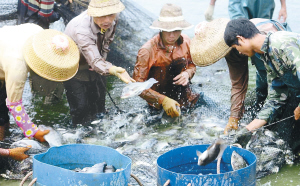 | 琼海市塔洋镇裕山地区罗非鱼养殖基地里,养殖户正忙着收获罗非鱼(资料照片)。 本报记者 陈德雄 摄 |