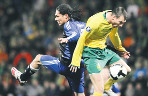 10月24日,在2008-2009赛季欧洲联盟杯小组赛中,德甲汉堡队客场以2比1胜斯洛伐克吉里纳队。图为汉堡队球员格雷罗(左)与吉里纳队球员沃马卡在比赛中拼抢。 新华社发
