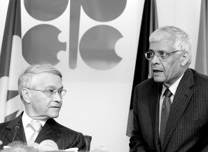 石油输出国组织(欧佩克)轮值主席、阿尔及利亚能源和矿业部长哈利勒(左)和欧佩克秘书长巴德里就作出每天减产150万桶原油决定后出席新闻发布会。哈利勒警告说,由于受金融危机冲击,产油国的能源行业正面临严峻的投资瓶颈,如果油价长期维持低位,将制约产油国进一步扩大产能。