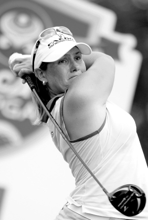 | 10月25日,大新华航空LPGA比赛在海口市西海岸高尔夫球场继续进行,英国选手斯塔普斯以134杆的成绩暂列第一。图为斯塔普斯击球。 新华社发 |