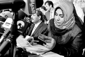 埃及出现 第一位女证婚人 10月25日,在埃及的沙尔基亚,女律师阿迈勒·苏莱曼(右)主持一对新人的结婚仪式。今年32岁的阿迈勒·苏莱曼被任命为埃及的第一位女性证婚人,她有权在婚礼上宣读证婚词,签署结婚证书和离婚证书。 新华社/路透