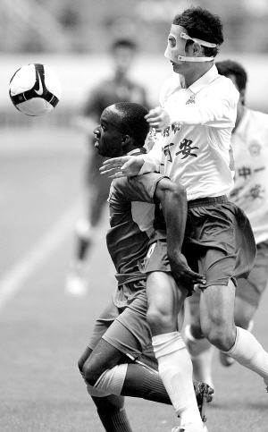 上海申花 登中超榜首 10月26日,在中超联赛第24轮的比赛中,上海申花队主场以3比2胜广州医药队,登上积分榜榜首。图为申花队球员斯科特(左)和对方球员争抢。 新华社发