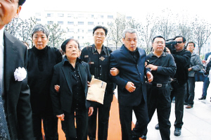 | 谢晋妻子徐大雯(左二)与其四子阿四(右二)前往告别厅为谢晋送行 |