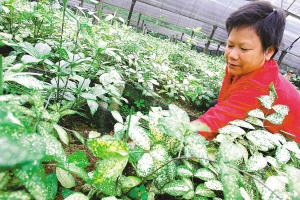 | 位于五指山市南圣镇铜甲村委会永忠村的海南大信园林有限公司五指山市花卉基地里,打工的村民王桂心正在给高级插花配材———星点木进行除草工作。 本报记者 张杰 摄 |