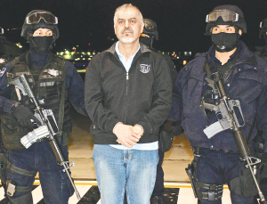 墨西哥警方10月26日宣布,抓获“阿雷利亚诺·费利克斯”贩毒集团二号人物爱德华多·阿雷利亚诺·费利克斯。该贩毒集团是墨西哥四大贩毒集团之一。这是墨西哥公共安全部10月26日发布的爱德华多(中)被捕的照片。 新华社/法新