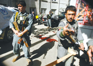 | 在阿富汗首都喀布尔市中心,时常看到警察持枪守卫。 新华社/路透 |