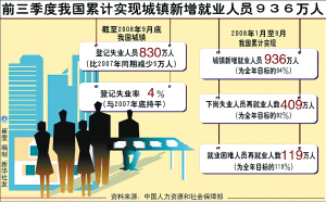 前三季度,我国城镇新增就业936万人,城镇登记失业率与前两个季度和去年底持平,城镇登记的失业人数830万,比去年同期减少5万。