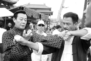 | 寇世勋(左)、尤勇(右)在《虎山行》片场研究动作戏 |