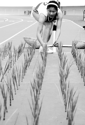28日,一名运动员在女子60米插秧比赛中。
