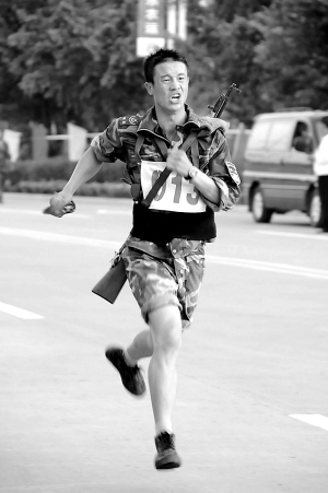 28日,辽宁选手费闯在五公里武装越野比赛中冲刺。