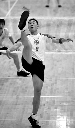 28日,在毽球男子团体比赛中,山西队以2:0战胜河南队。图为河南队队员王磊(前)在比赛中。