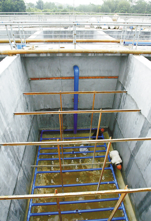 龙塘污水处理厂加紧施工 日处理污水5000吨的海口龙塘污水处理厂,于今年3月28日破土动工。目前,土建主体工程已基本完工,总投资1200多万元的整体工程量已完成70%多,预计年底竣工调试后投入使用。图为10月28日,两名工人师傅正在生物接触氧化池内作业。本报记者 苏晓杰 摄