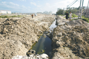 工程于今年3月28日开工,原计划工期一年时间。但7个月过去了,工程的前期准备工作还没完成,沿路凹凸不平,前段时间的连续降雨更使道路泥泞不堪,根本无法通行(见右图,本报记者程范淦摄),严重影响了周边3万多群众的出行,民怨比较强烈。包括本报在内,曾有多家报道关注过此事。《救救被困“城市孤岛”的三亚学子》、《关于荔枝沟的道路———致三亚市委、市政府的信》……在南海网、天涯社区、海南在线等各大论坛、网站上,反映三亚金鸡岭路延伸段改造工程的帖子四处可见,引发群众热议,受到社会的广泛关注。