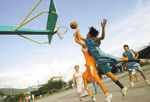 | 五指山中学学生正在课间进行体育活动。 本报记者 张杰 摄 |