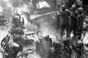 | 10月30日,在印度东北部阿萨姆邦的高哈蒂,消防人员扑救因爆炸引发的大火。