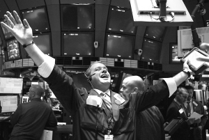| 10月29日,交易员在美国纽约证券交易所交易员观看美联储降息的电视报道。当日,美国联邦储备委员会决定将联邦基金利率下调至1%。受降息和公司消息等多种因素影响,纽约股市三大股指涨跌不一,其中道琼斯30种工业股票指数下跌74.16点,收于8990.96点。 新华社记者 侯俊 摄 |