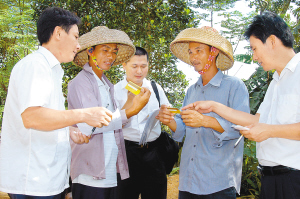 为更好地为“三农”服务,中国农业银行从2008年4月开始在全国18个省试点发行金穗惠农卡,这一新型金融产品除具备银行卡基本金融功能外,还可向持卡农户提供小额贷款、财政补贴代理等特色服务,并给予一定的金融服务收费减免优惠。 该卡在琼海刚上市立即受到群众的追捧。农行琼海市支行计划从九月开始至年底发卡7000张,但不足10天群众就认领了9000张。图为11月1日,琼海农行的员工向群众介绍惠农卡使用方法。 特约记者 蒙钟德 摄