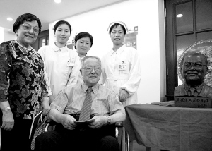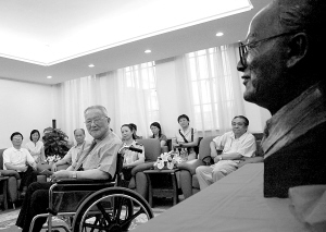 | 2005年6月,在上海参加遗传学研讨会的代表来到华东医院看望谈家桢先生,并送上了谈先生半身像作为礼物。