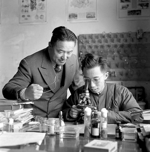 | 上世纪50年代,谈家桢(左)在进行细胞观察工作。