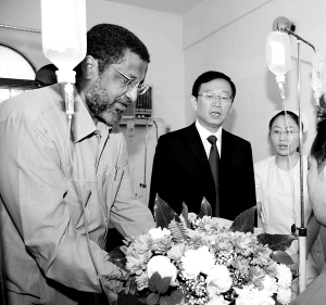 11月2日,苏丹能源与矿产部长祖贝尔·哈桑(左一)在中国驻苏丹大使李成文(左二)的陪同下,在喀土穆一医院看望在此接受治疗的4名获救中国工人。10月18日,中石油公司9名员工在苏丹西南部一施工现场被武装分子绑架,其中5人已被确认遇害,4人获救。 新华社记者 邵杰 摄