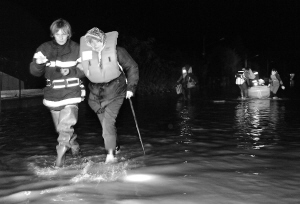 11月2日,在法国中部布拉萨克莱米讷地区,救援人员转移当地居民。据法国营救机构称,法国一些地区由于受暴雨侵袭致使大批人员撤离家园。 新华社/法新
