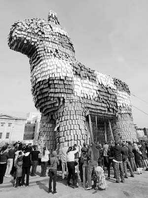长约28.5米、高18.9米,内装重达3600多公斤的糖果 11月2日,在美国费城,人们聚集在巨型“皮纳塔”玩偶旁参观。据介绍,这个驴子造型的“皮纳塔”玩偶长约28.5米、宽7.2米、高18.9米,内部由重达3600多公斤的糖果填充,因而打破吉尼斯世界纪录,成为目前世界上最大的“皮纳塔”玩偶。“皮纳塔”玩偶是西方一些国家在节日时用于欢庆活动的道具,人们将糖果、玩具等装入玩偶内部,然后让孩子们蒙上眼睛,轮流拿棍子击打悬挂起来的“皮纳塔”。 新华社/法新