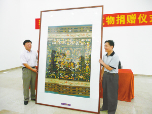 11月3日,海南出版社副编审、中国美术家协会会员、海南省美术家协会副主席蔡於良(右)将36件个人藏品捐赠给省博物馆。 本报记者 黄晶 摄 (相关报道见A8版)
