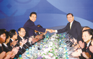 | 11月4日,海峡两岸关系协会会长陈云林(左立者)与海峡交流基金会董事长江丙坤(右立者)在台北举行正式会谈。