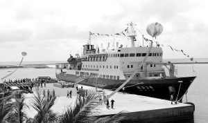 | 2005年2月10日,“琼沙3号”在西沙永兴岛新港码头首航。 本报记者 王军 摄 |