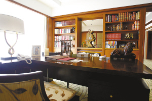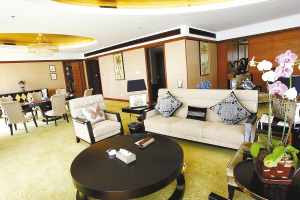 打开套房大门,一条走廊将套房一分为二,右边是主房,左边是两间随从房。其中主房就包括卧室、书房、会客厅、餐厅、更衣室、棋牌室、洗浴间、钢琴室等,设计及用料一丝不苟,室内既有仿古欧式名贵木制家具,也有典型的现代东方国家的新式卧具。
