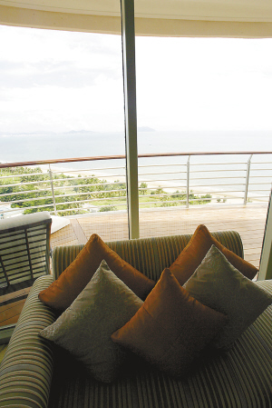 最令人叫绝的是,套房有一个300度海景的阳台,将主房及随从房连成一个弧形,坐在套房里隔着双层厚玻璃板,可将三亚湾及市区景色尽收眼底。阳台上还摆放了休息靠椅及运动器械,站在阳台上,所有的烦恼及抑郁尽随风而去。