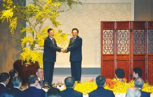 11月4日,连战与陈云林握手致意。 当日,中国国民党荣誉主席连战在台北宴请海协会会长陈云林一行。 新华社记者 邢广利 摄