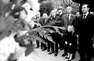 11月4日,法国负责国防和退伍军人事务国务秘书波盖尔(右二)和中国驻法大使孔泉(右一)在法国巴黎参加“纪念一战九十周年,缅怀为法捐躯华工先辈”仪式。一战期间,盟军招募14万多名华工到欧洲战场,其中近2万人在法捐躯。 新华社记者张玉薇摄