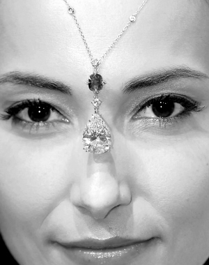 11月6日,模特在展示一条将被香港佳士得拍卖行拍卖的足色全美梨形钻石吊坠和红宝石项链,估价2000到3000万港元。 新华社记者 黄本强 摄