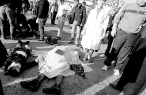 11月6日,在俄罗斯北奥塞梯的弗拉季高加索,人们在爆炸现场查看。据俄罗斯安全部门称,当日,在弗拉季高加索,一辆公共汽车发生爆炸,造成11人死亡。 新华社/法新