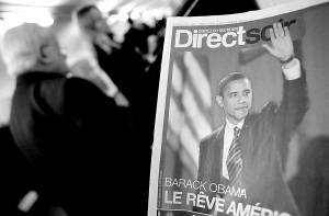 | 11月5日,在法国巴黎的地铁内,乘客拿取刊登了奥巴马当选的报刊。 新华社发