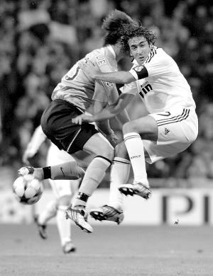 | 皇家马德里队球员劳尔(右)与对方球员争抢。新华社发 |
