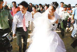 11月6日,体操名将杨威和新娘杨云在三亚天涯海角旅游风景区举行婚礼。 本报记者 王凯 程范淦 摄