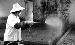 | 经过多年的建设,我省已经有能力应对突发公共卫生事件。图为海口市紧急组织人员对卫生死角进行消毒。
