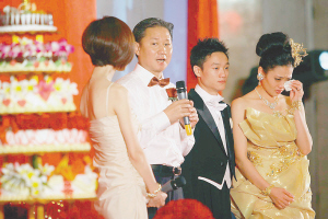 中国体操队总教练黄玉斌在上台致辞时也数度哽咽。他说杨云从小就被他认做干女儿,而杨威则是他带了12年的徒弟,早已经情同父子。他说,他和杨威共同经历了一段非常艰难的岁月,但是终于挺过来了,现在看到杨威和杨云成婚,他此时的感觉更像是一个快乐的父亲。情深意切的致辞,赢得来宾们阵阵热烈的掌声。