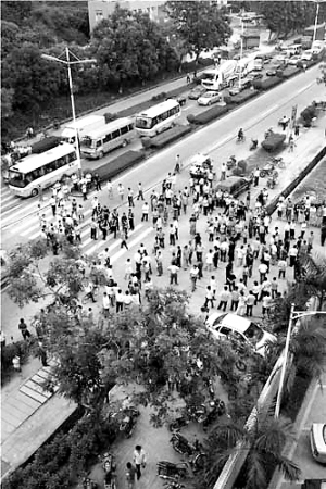 经深圳警方初步核实,发生事件时,该检查点没有派出所民警,仅在距离检查点约300米处有交通民警执勤。但李国超的家属误认为此次查车行动是石岩交警中队组织,遂于13时许召集30余人到石岩交警中队,要求交出带队查车的民警及街道办检查人员,并堵住交警中队大门。14时30分,死者家属又将死者尸体抬到交警中队,并在交警中队大院内打砸物品、燃放鞭炮。至17时许,聚集在石岩交警中队大门的人增至400余人,在外围围观人员达2000余人。后来,少数不法人员在现场扔石头,掀翻并点燃警车。