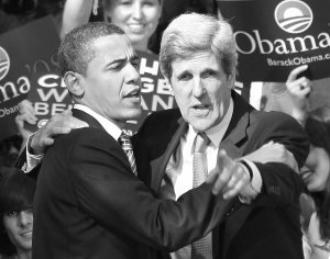 据美国媒体11月7日援引美国民主党方面消息,前民主党总统候选人约翰·克里谋求担任当选总统奥巴马新内阁的国务卿一职。图为奥巴马(左)与约翰·克里在一起。 新华社/法新