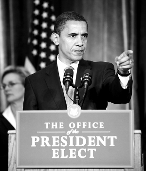 美国当选总统贝拉克·奥巴马美国中部时间7日在芝加哥市召开竞选胜利后首次新闻发布会,阐述自己就职后的中心任务,回答记者提问。
