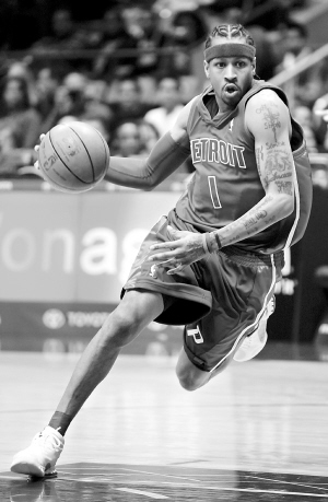 11月8日,在NBA常规赛中,底特律活塞队客场以96比103不敌新泽西网队。此役艾弗森穿着1号球衣首次代表活塞队出战,他全场得到24分6次助攻。图为艾弗森带球进攻。 新华社发