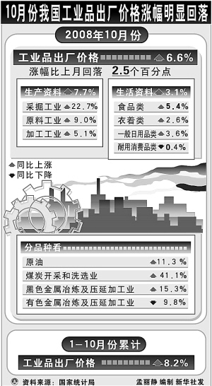从一些重要工业品,特别是能源原材料产品的价格看,10月份出厂价格的同比涨幅出现了非常明显的回落,甚至价格下跌。