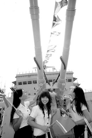 在泰国曼谷港,登上中国海军“郑和”号训练舰参观的中国留学生代表观看舰上的大炮。