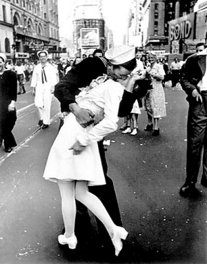 1945年8月15日,日本宣布无条件投降,二战以盟军胜利宣告结束。纽约时报广场上,一名年轻水手难捺心头喜悦,揽起身旁一名素不相识、穿白色制服的护士,大胆亲吻。