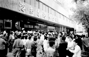 | →这是1993年位于海口市海秀路的金山大厦前的炒股人群。