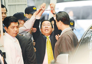陈水扁随即被戴上手铐,带往离特侦组不远的台北地方法院(左图)。目前,台北地方法院正召开声押庭,可能于晚上稍后时间作出是否收押的裁定。